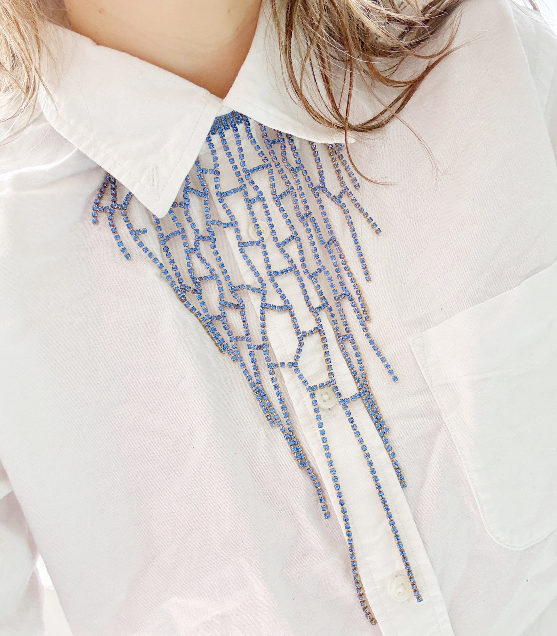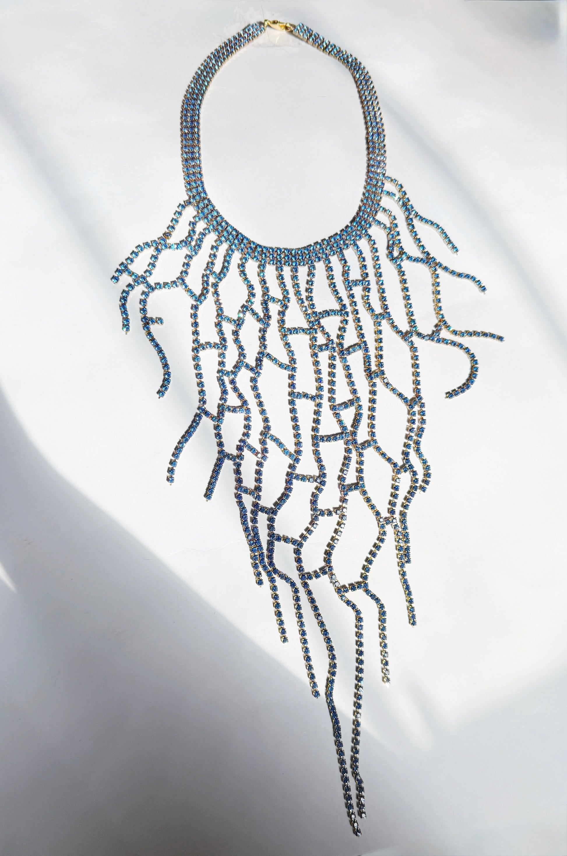 One of a kind piece made with excess and leftover rhinestone chain. Soldered together to make the most a statement necklace