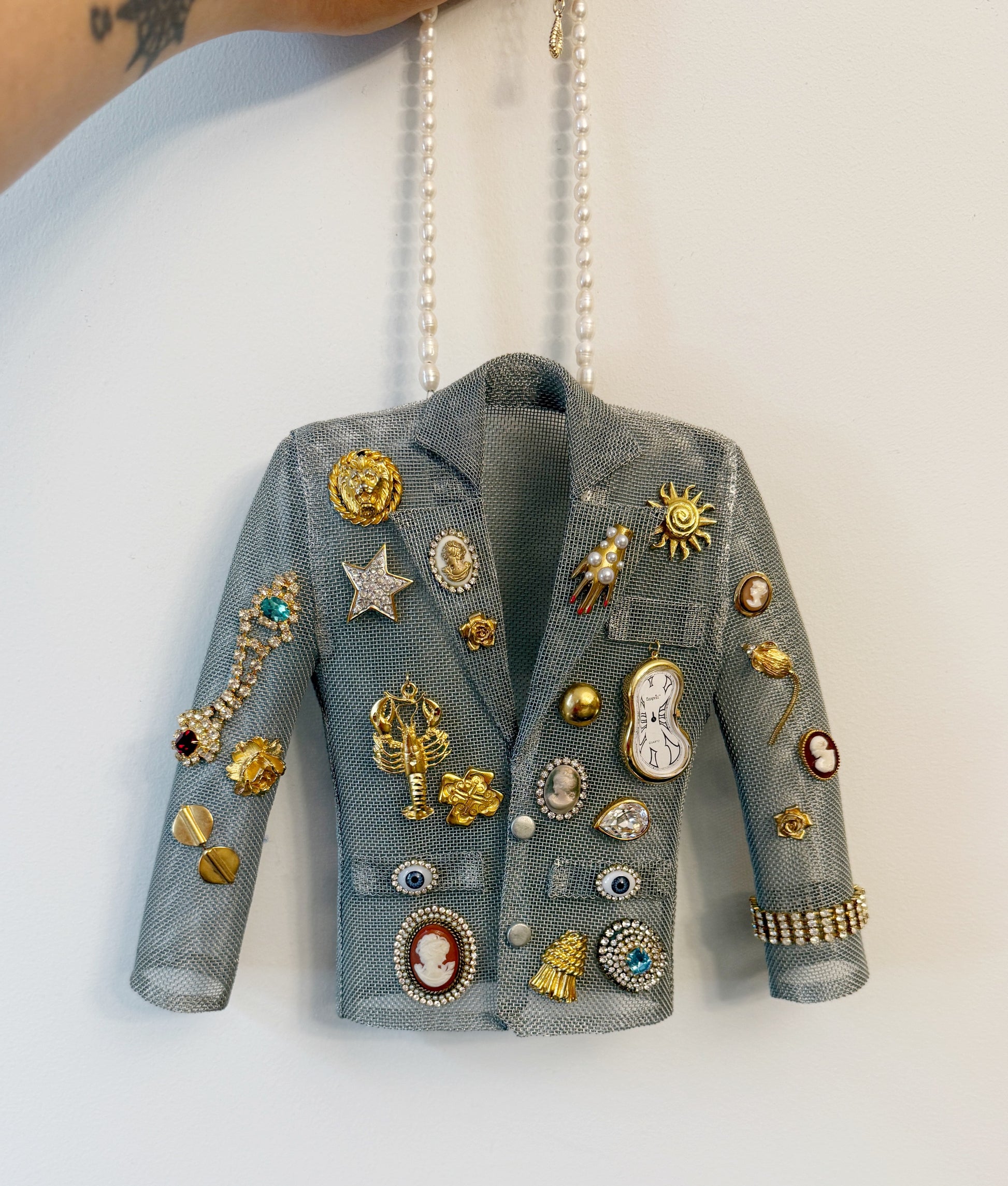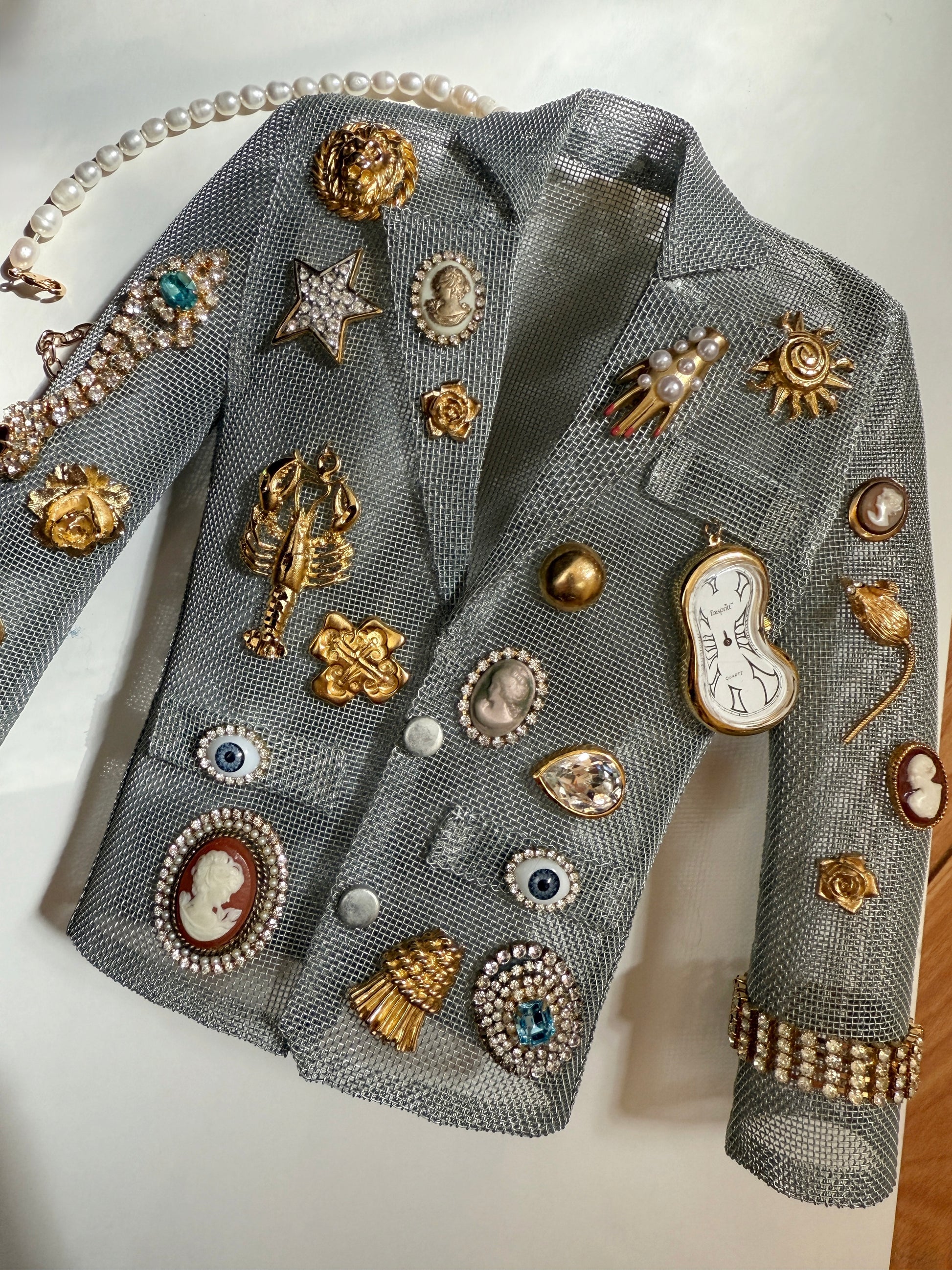 1990’s silver mesh blazer sculpture adorned with vintage and handmade pieces with a freshwater pearl chain