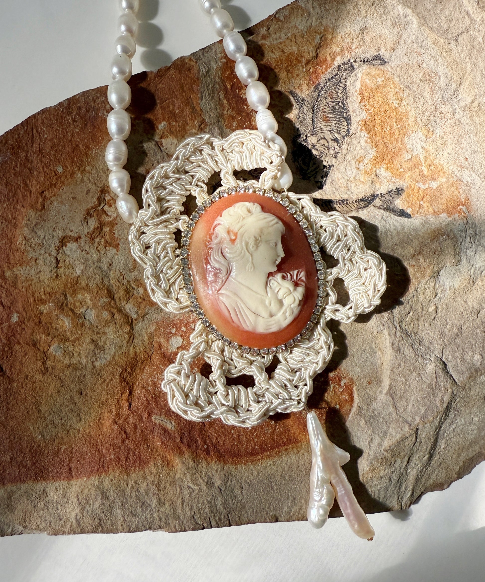 hand crocheted shell motif vintage cameo and freshwater pearls