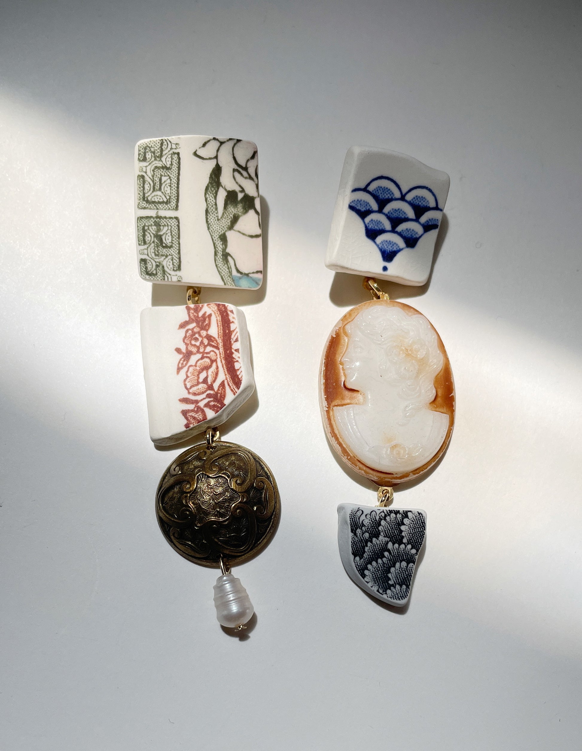 Gorgeous ceramic cameo earring with vintage glass cameo/ freshwater pearl/ brass vtg piece