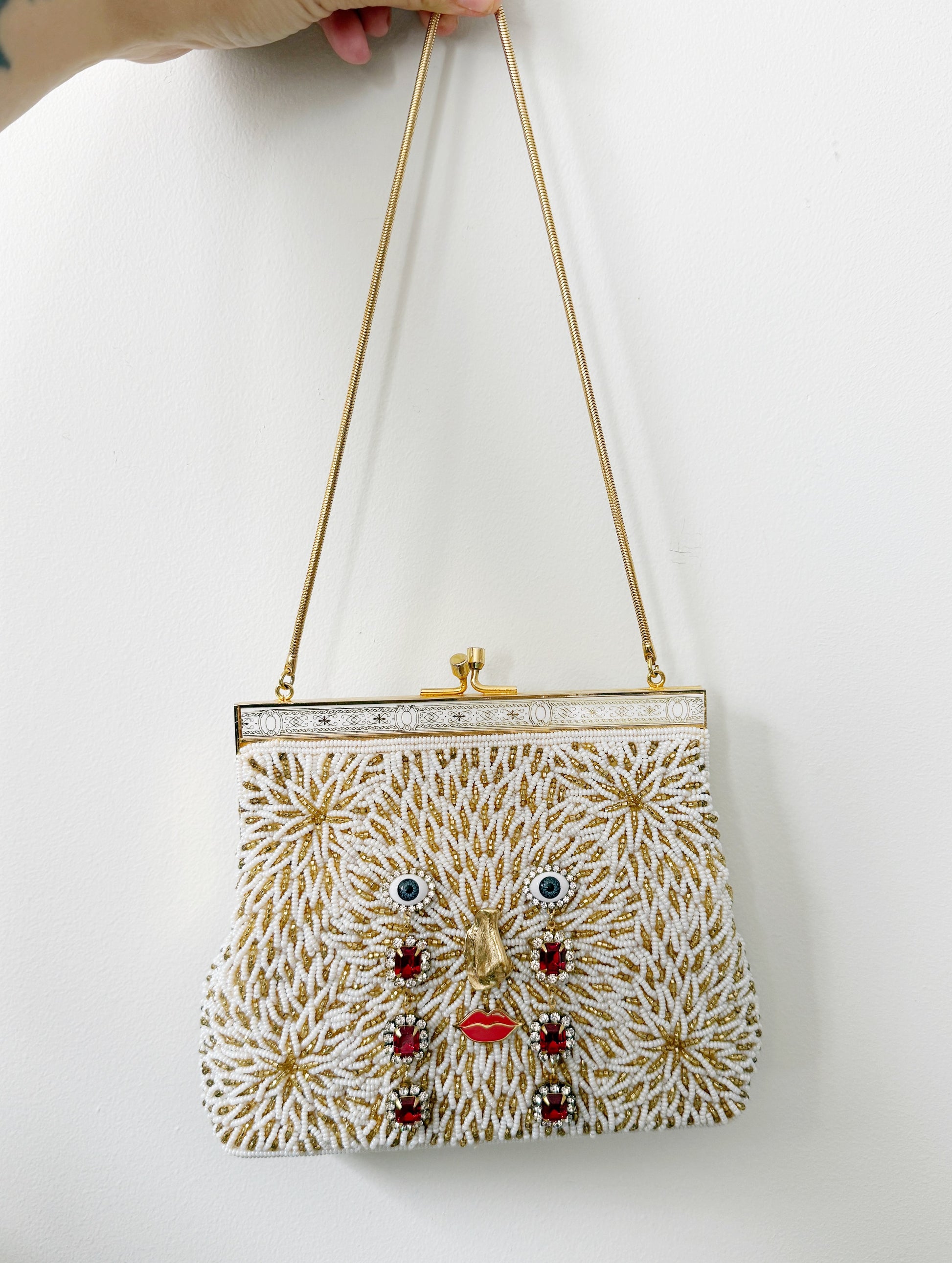 gorgeous 1950’s white and gold beaded purse with white and gold enamel detail - strap fits over the shoulder