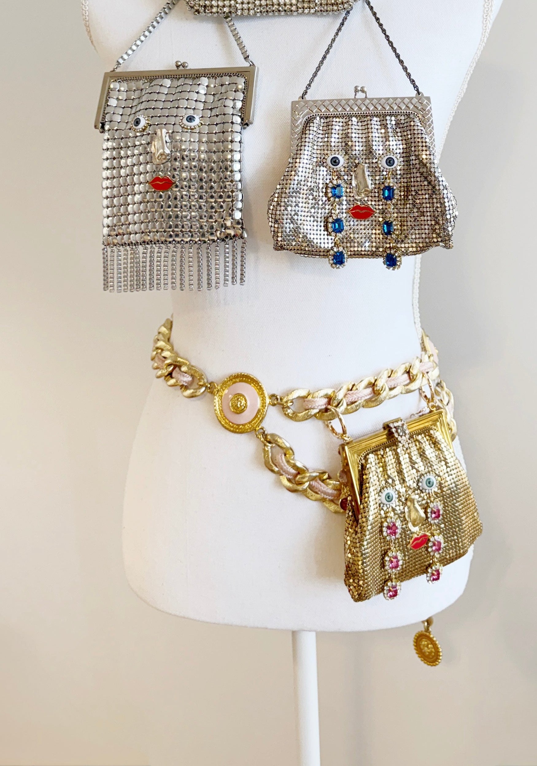 Vintage gold Mesh mini purse with an added face* handmade nose, rhinestones eyes, and red lips and a pink rhinestone tears