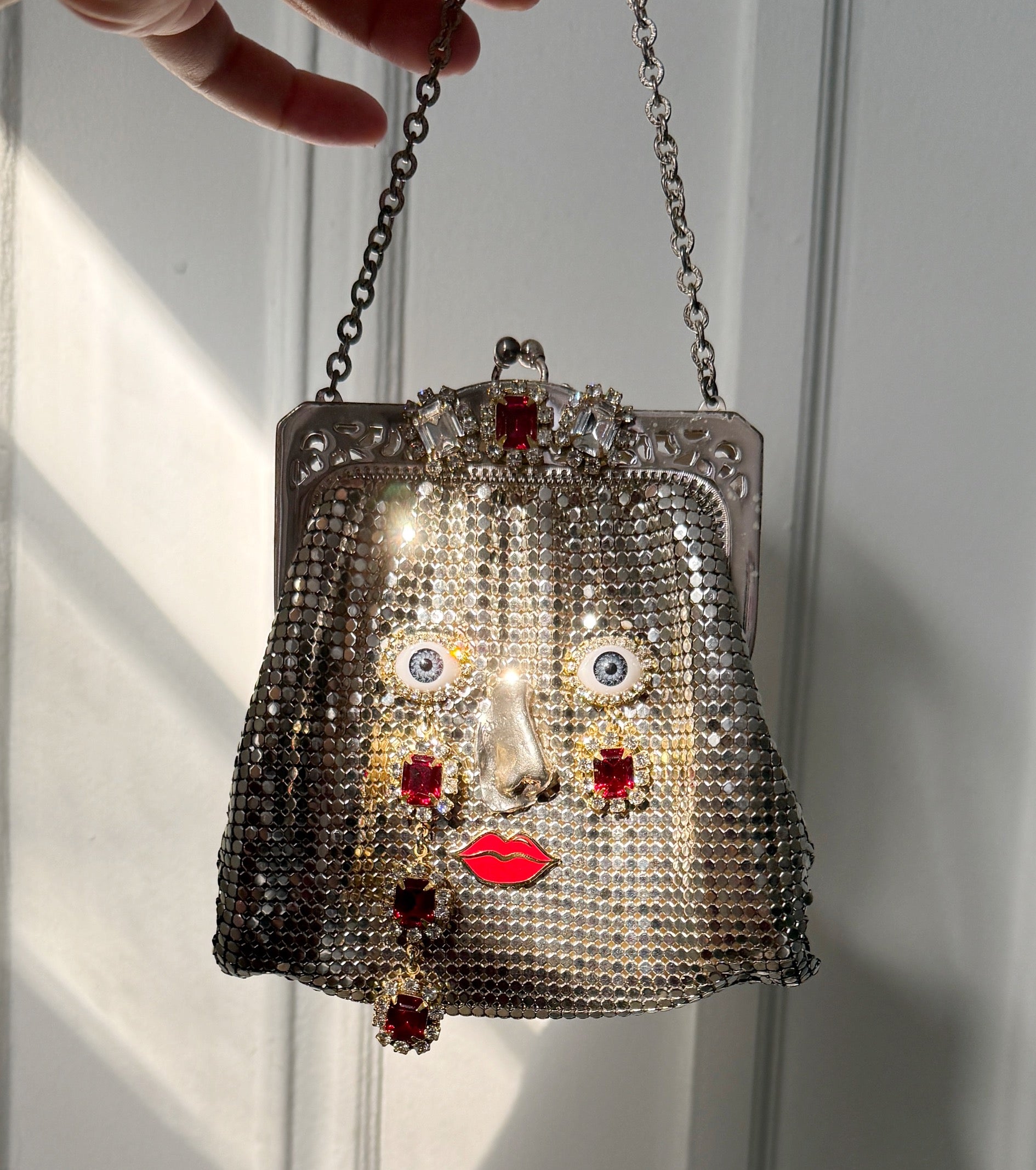 Vintage silver mesh whiting and davis purse with an added face* handmade sterling silver nose, rhinestones eyes, and red lips and hand wrapped Australian rhinestones for tears