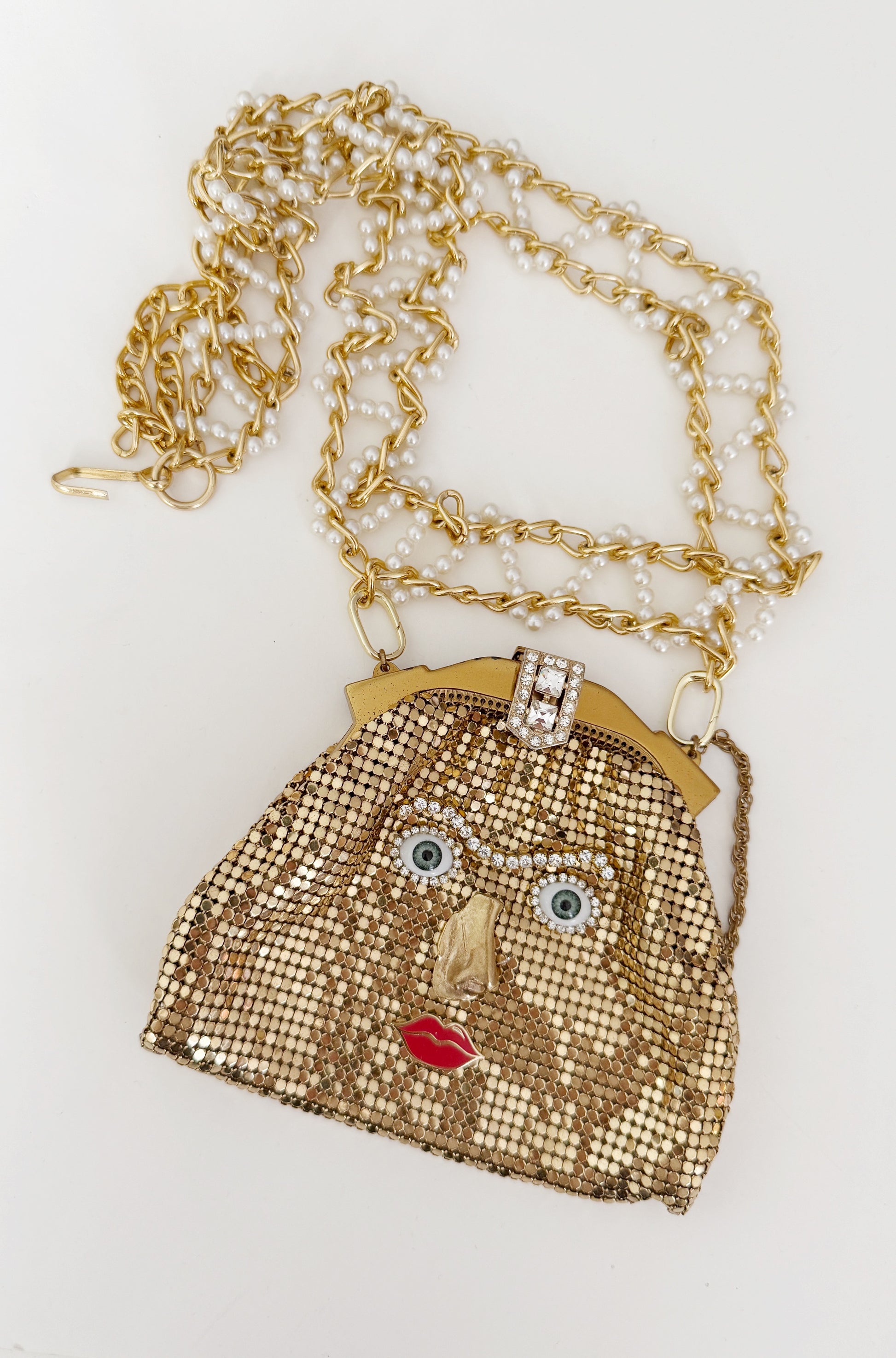 Vintage gold Mesh mini purse with an added face* handmade nose, rhinestones eyes, and red lips and a rhinestone brow as an ode to Frida Kahlo edition!
