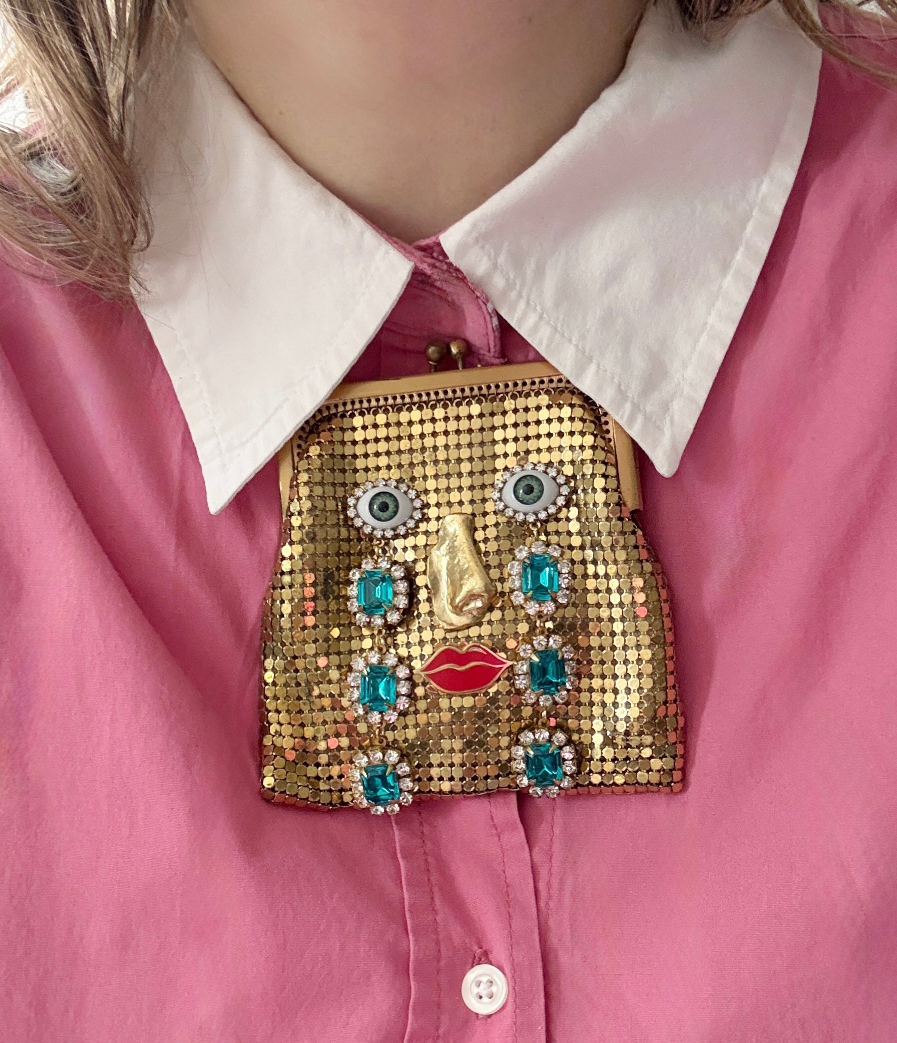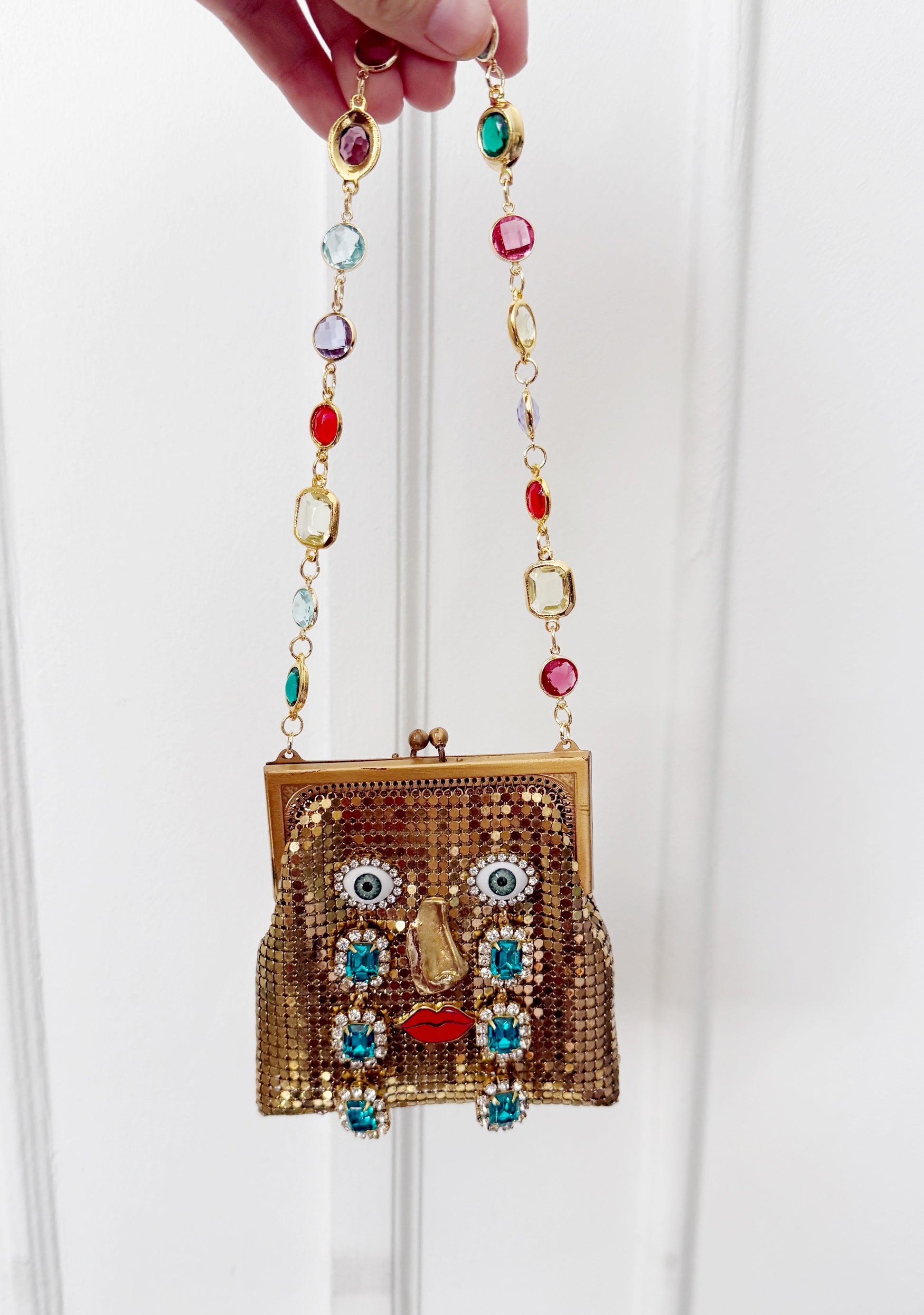 Vintage Whiting And Davis gold Mesh mini purse with an added face* handmade nose, rhinestones eyes, and red lips and a glass stone chain that can be worn as a necklace