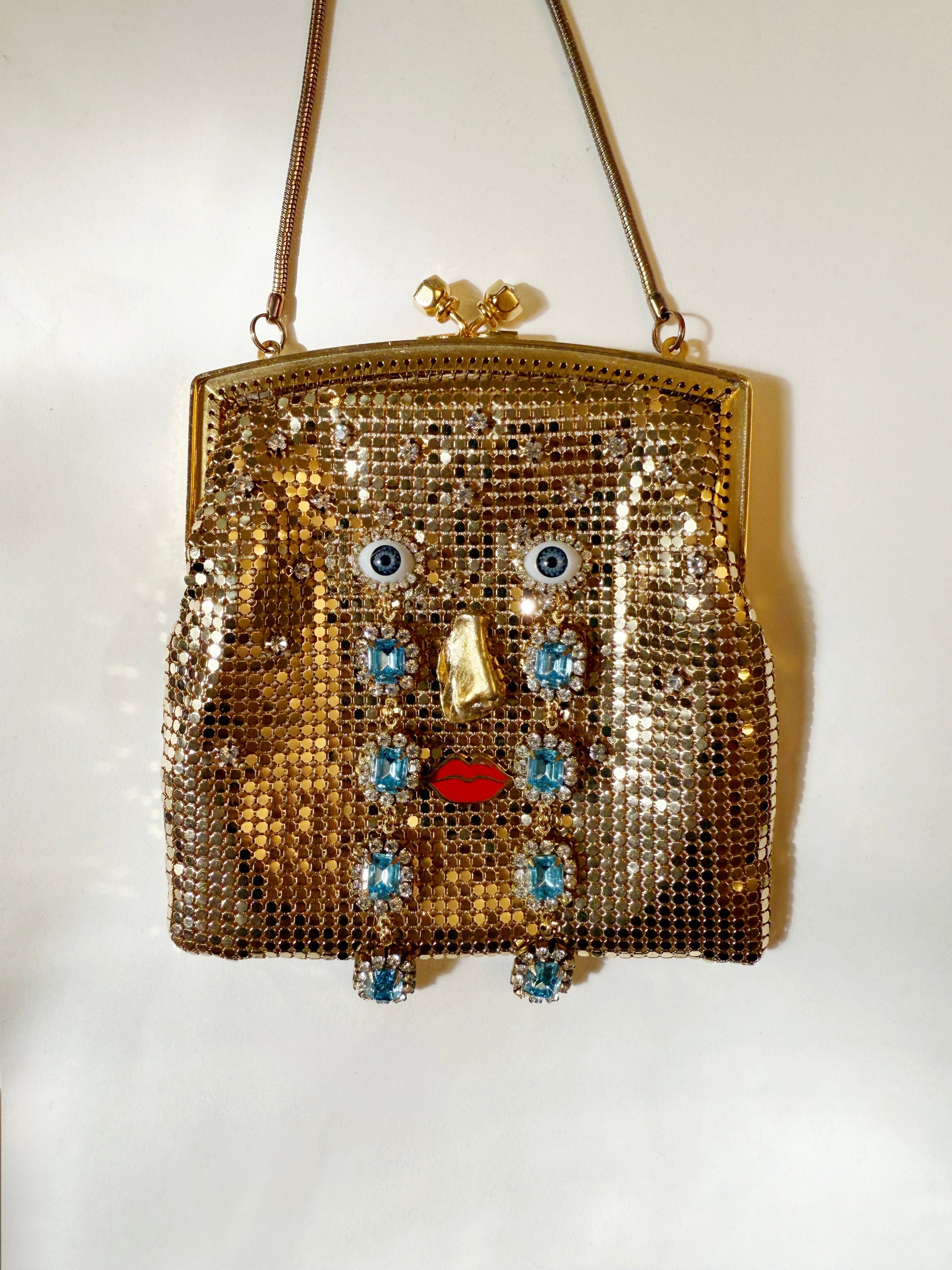 Vintage gold Mesh rhinestone purse with an added face* handmade nose, rhinestones eyes, and red lips and handmade rhinestone tears