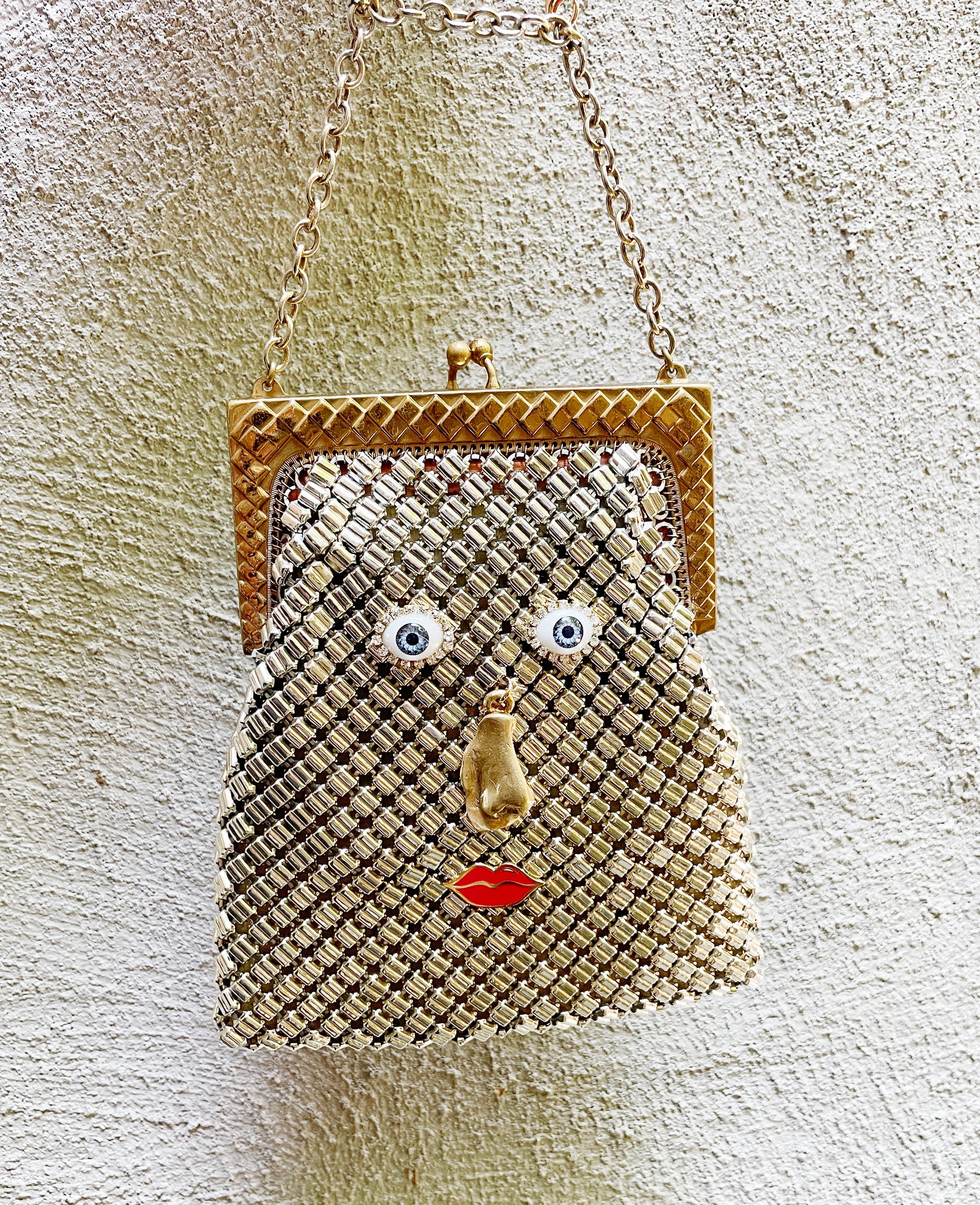 Vintage Whiting And Davis gold Mesh mini purse with an added face* handmade nose, rhinestones eyes, and red lips