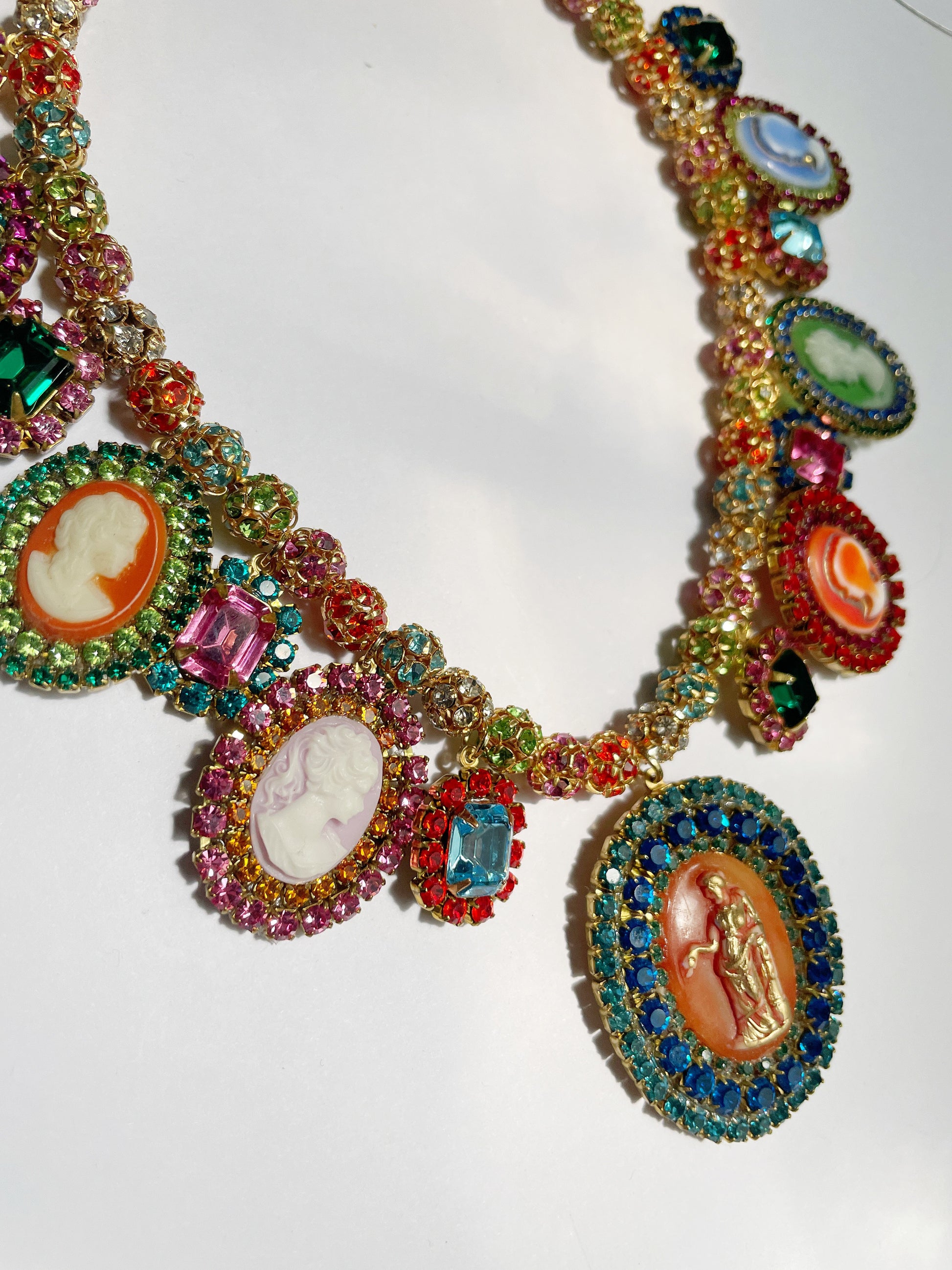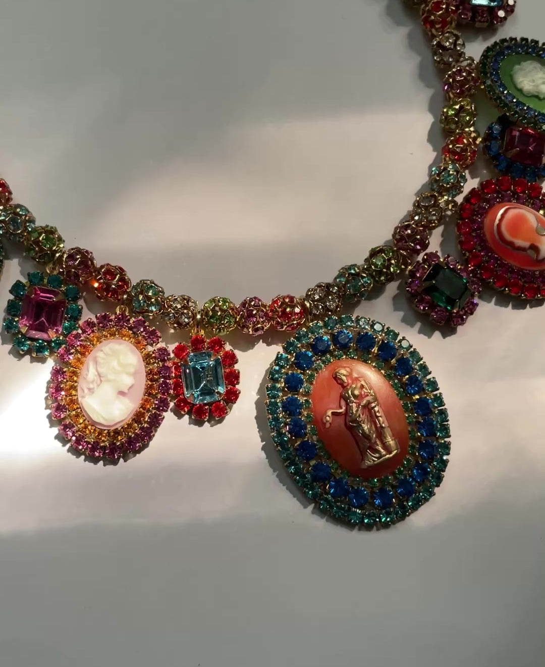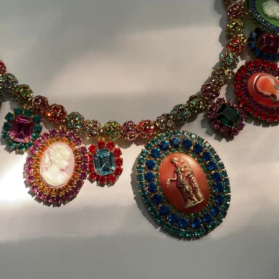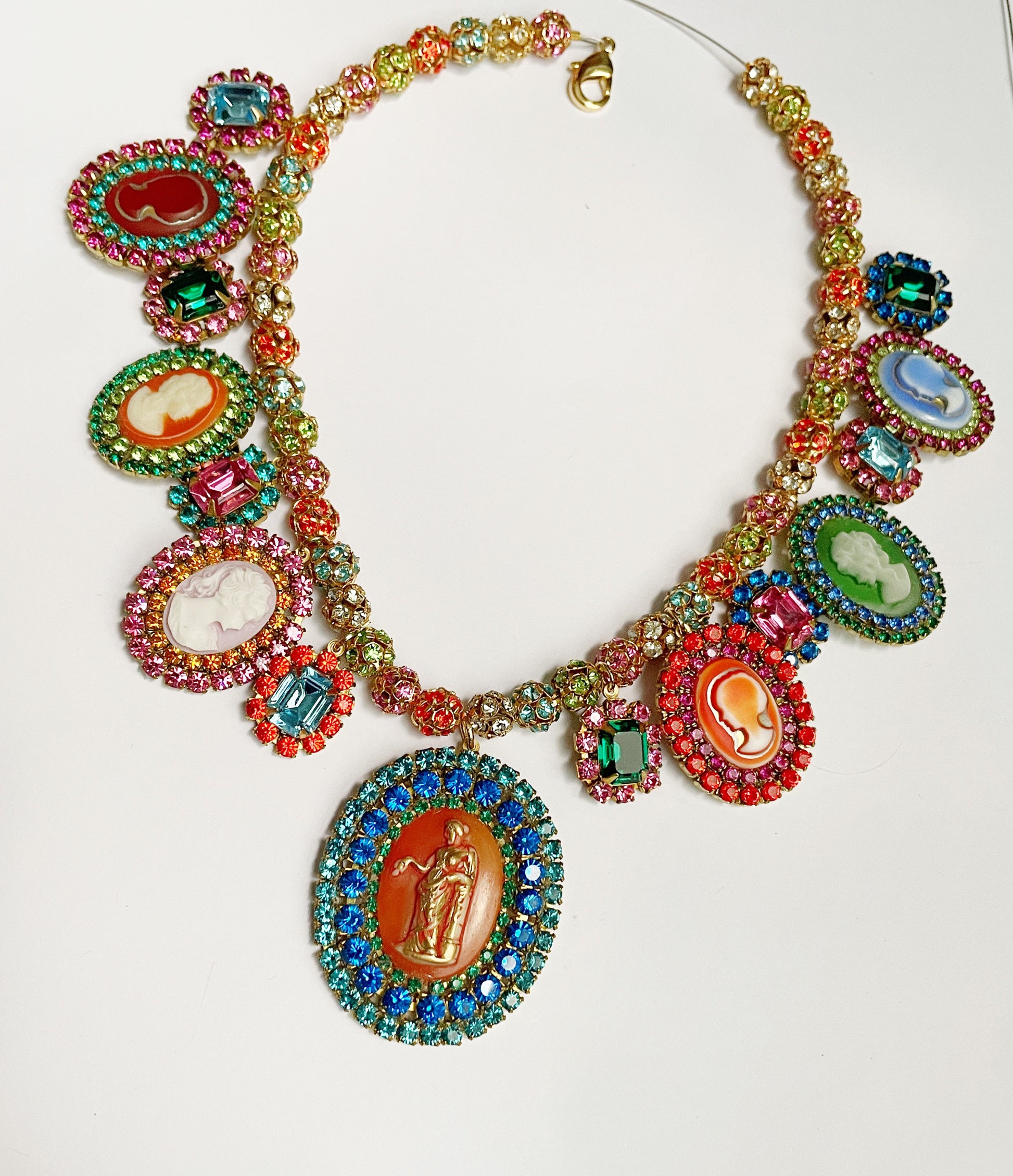 Every cameo unique with their own bright vintage rhinestone color along with handmade rhinestone charms. The beads are vintage rhinestones and so very special.