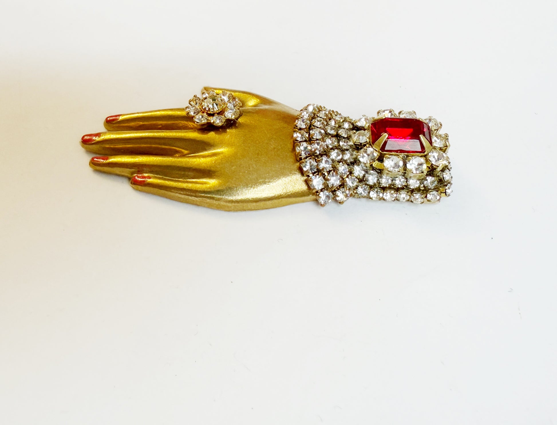 original hand design cast in brass dripping in vintage rhinestones with red painted finger nails!