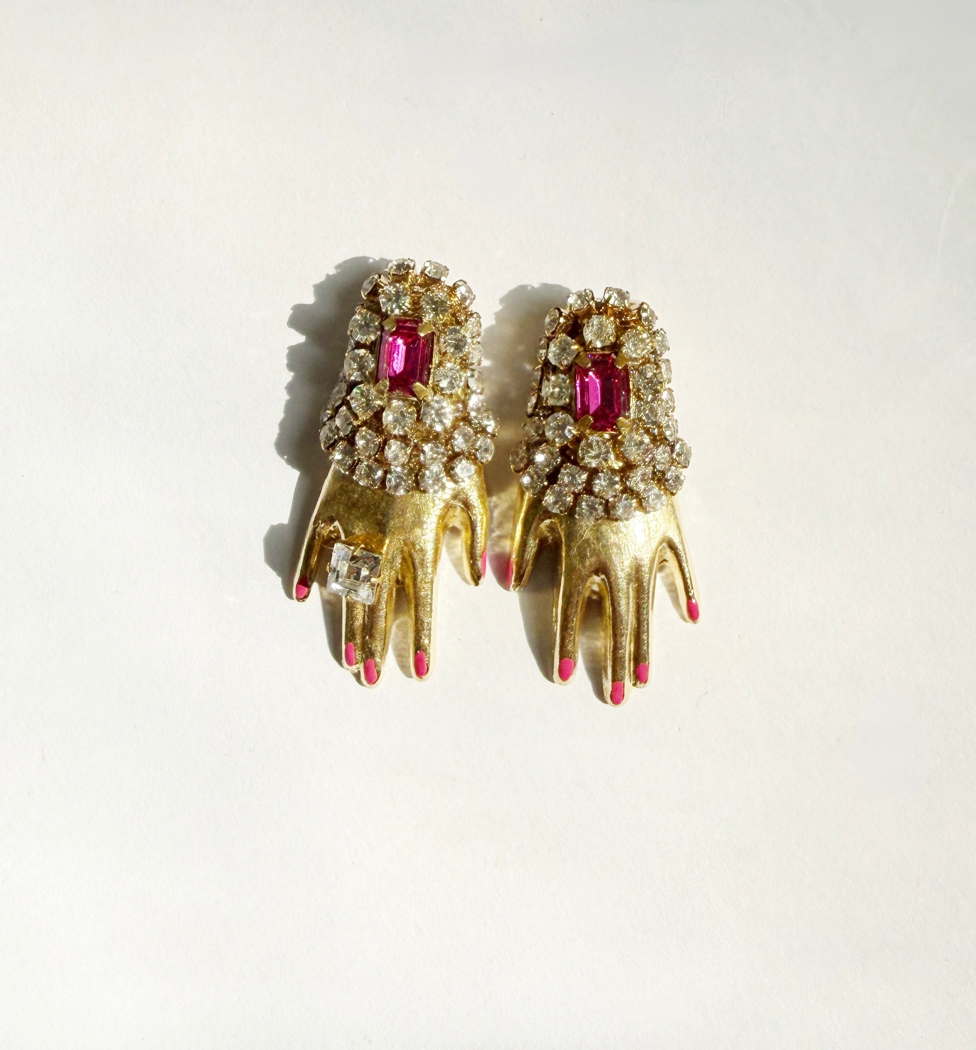 polished brass hands with vintage rhinestones in clear and pink magenta crystal & pink enamel painted nails