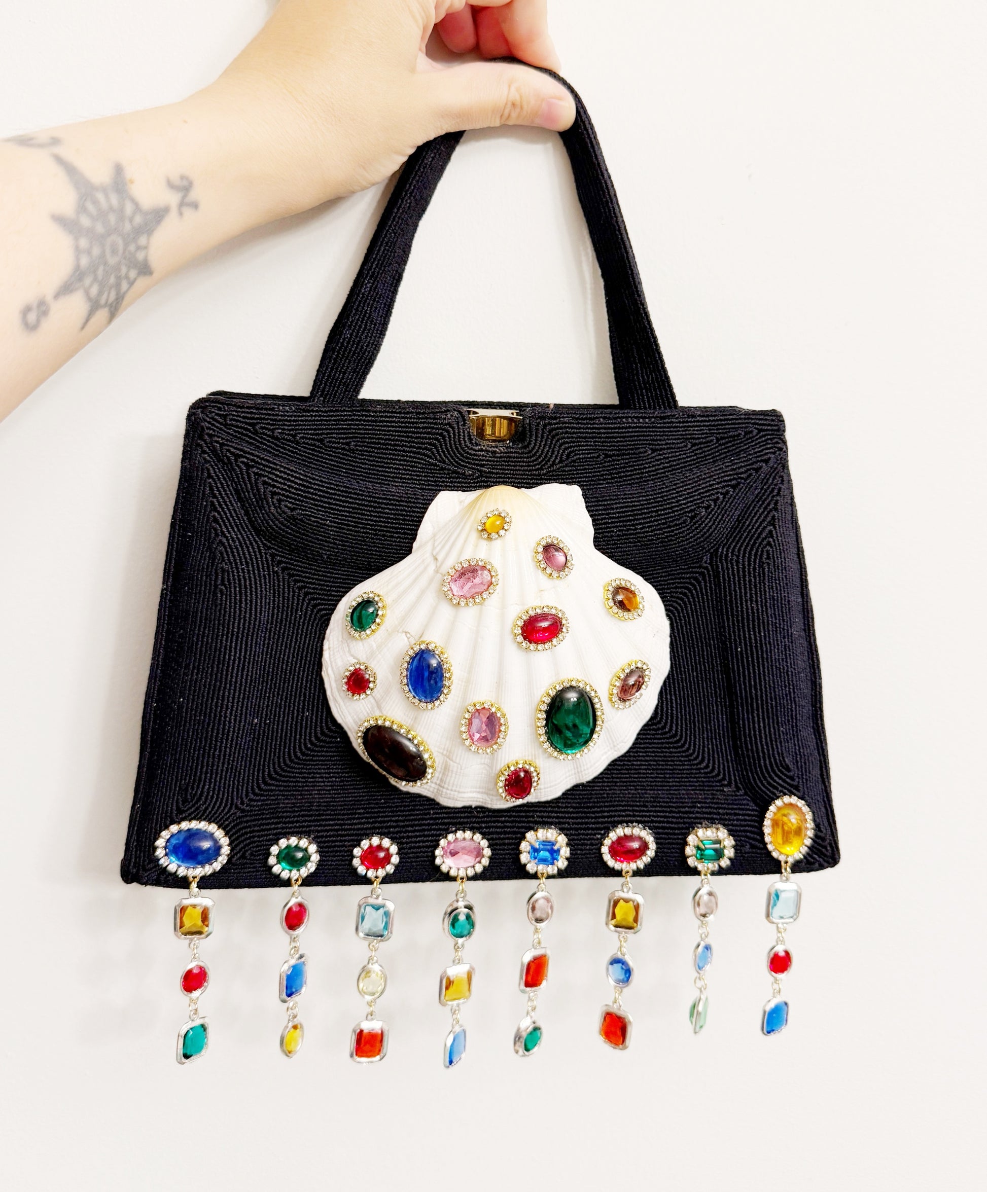 Gorgeous vintage black fabric cord purse with a massive scallop shell and vintage wrapped rhinestones