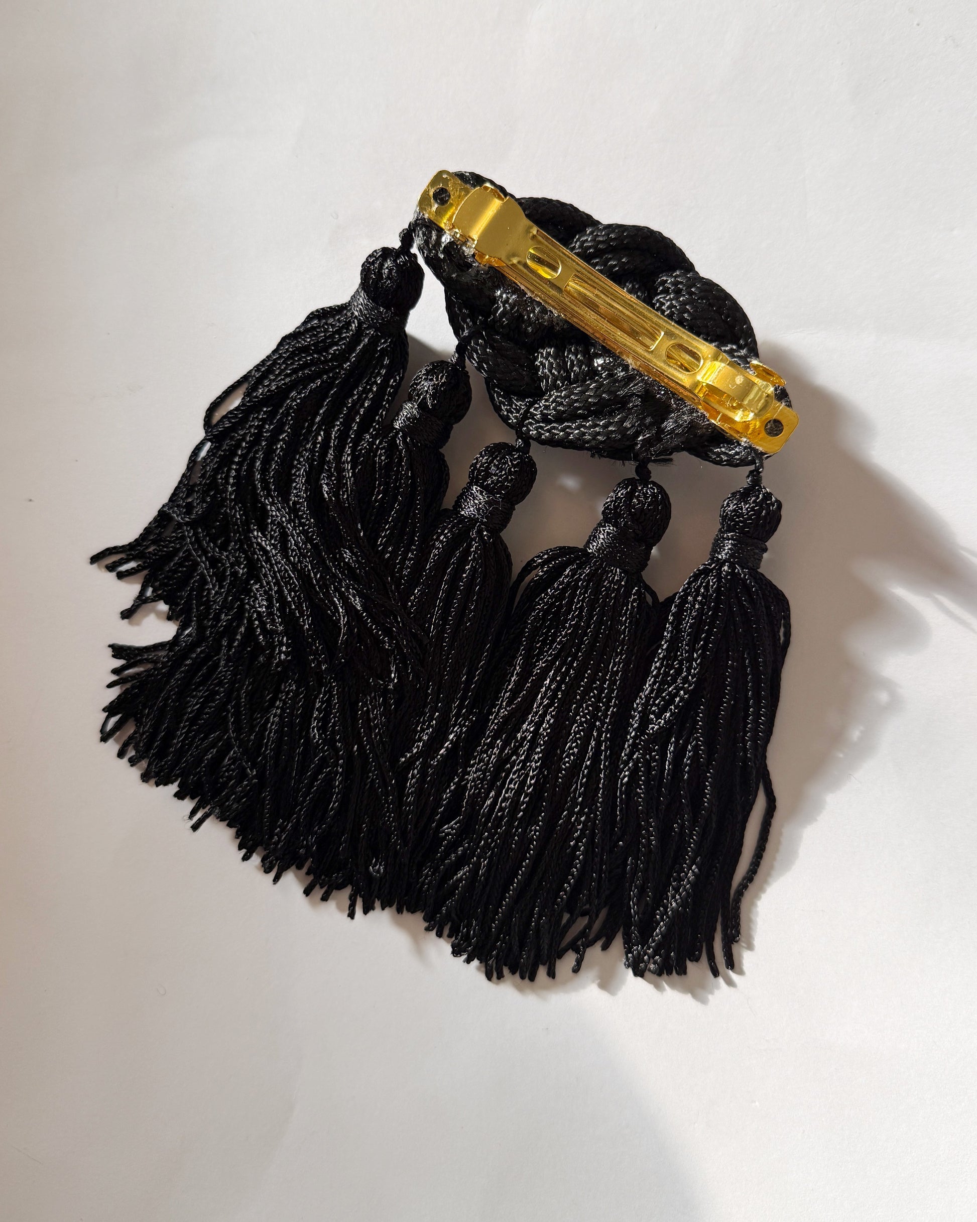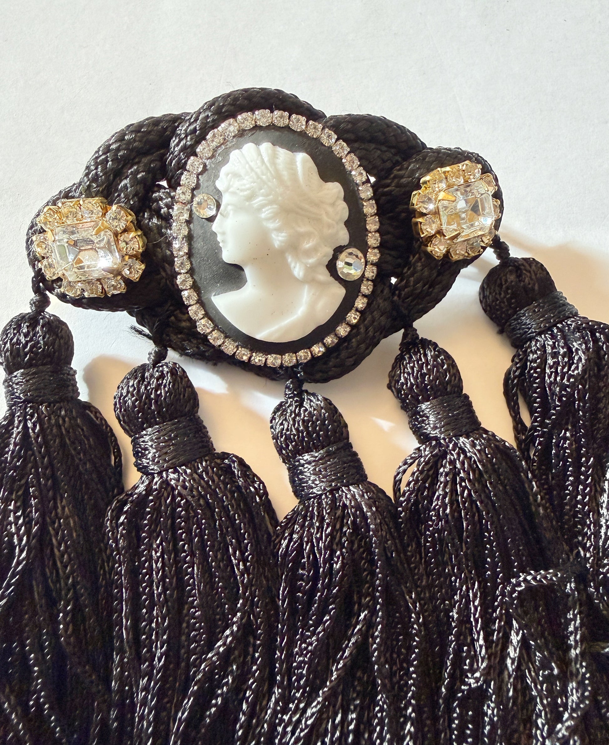 Black cameo barrette, vintage rhinestones, vintage ceramic cameo and gorg tassel pieces
