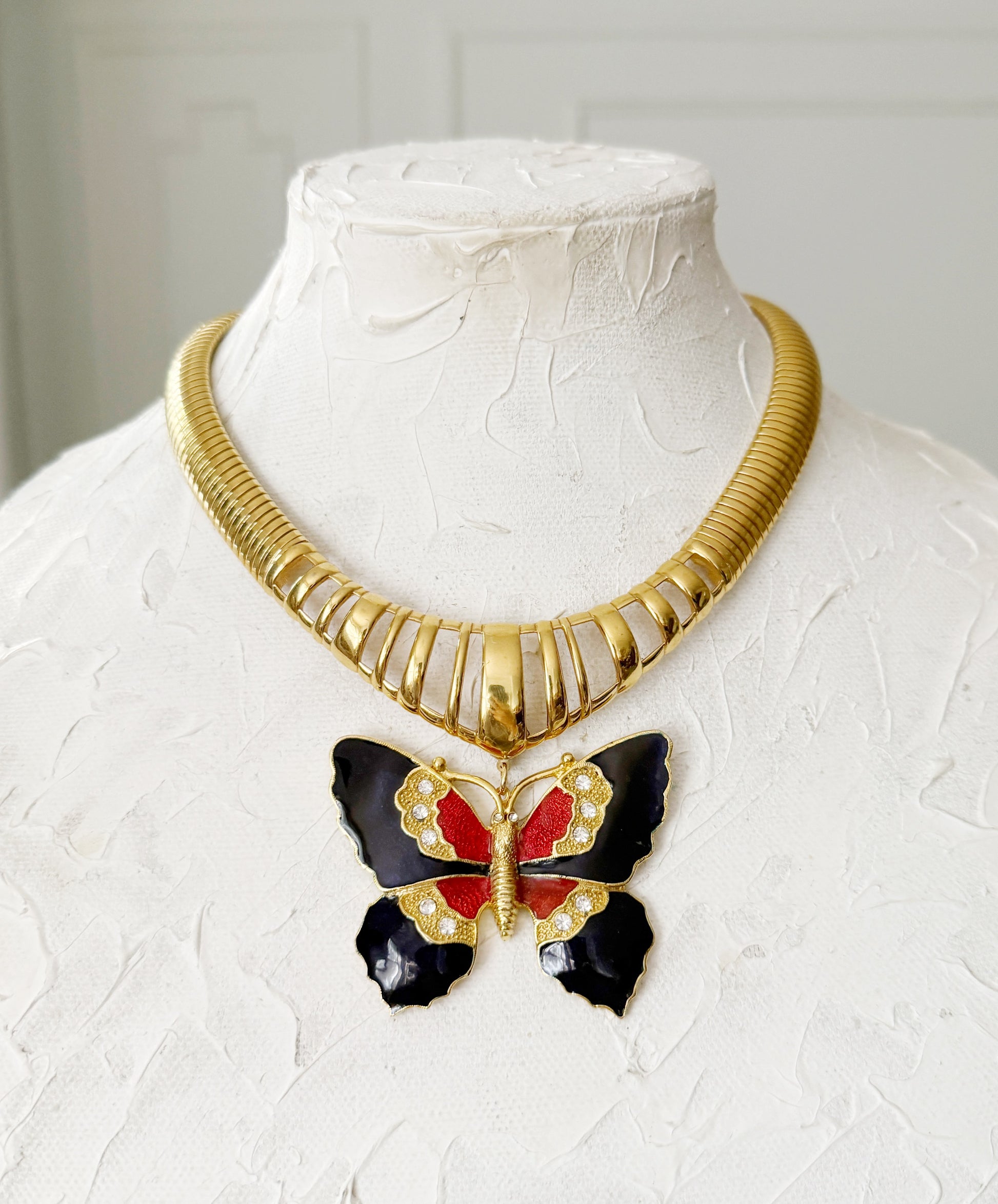 large enamel butterfly in a dark vang with red accents and rhinestones 3”