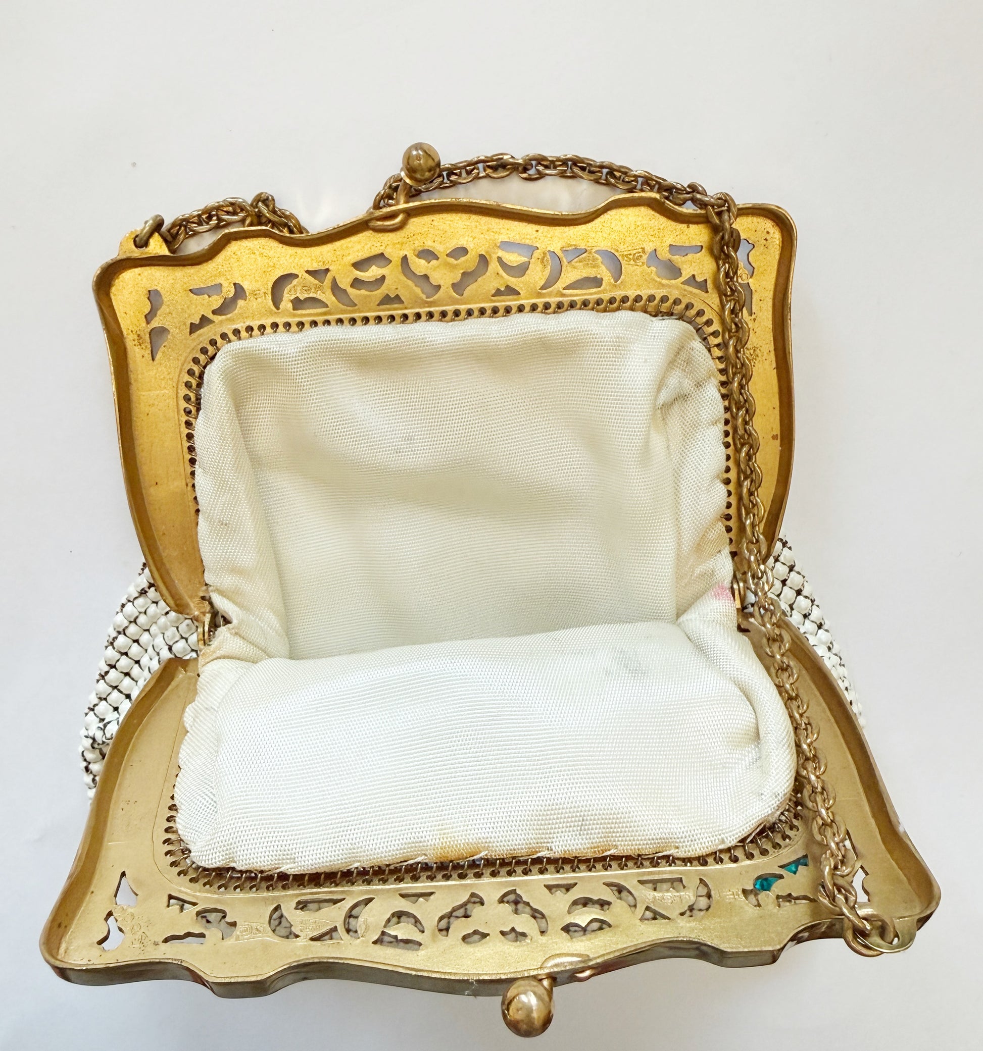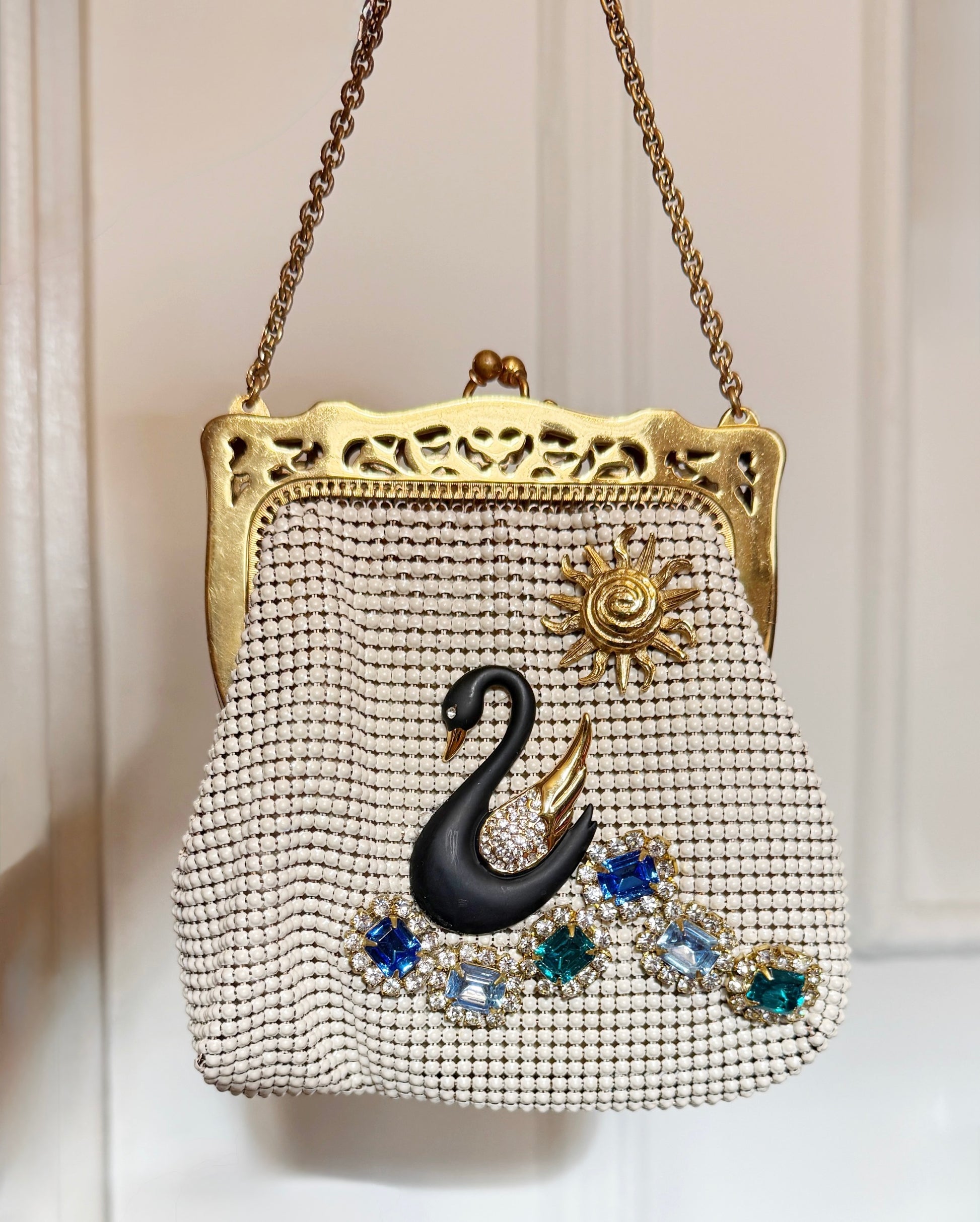 Vintage Whiting And Davis white enamel Mesh mini purse with black rhinestone swan, rhinestone lake and gold sun