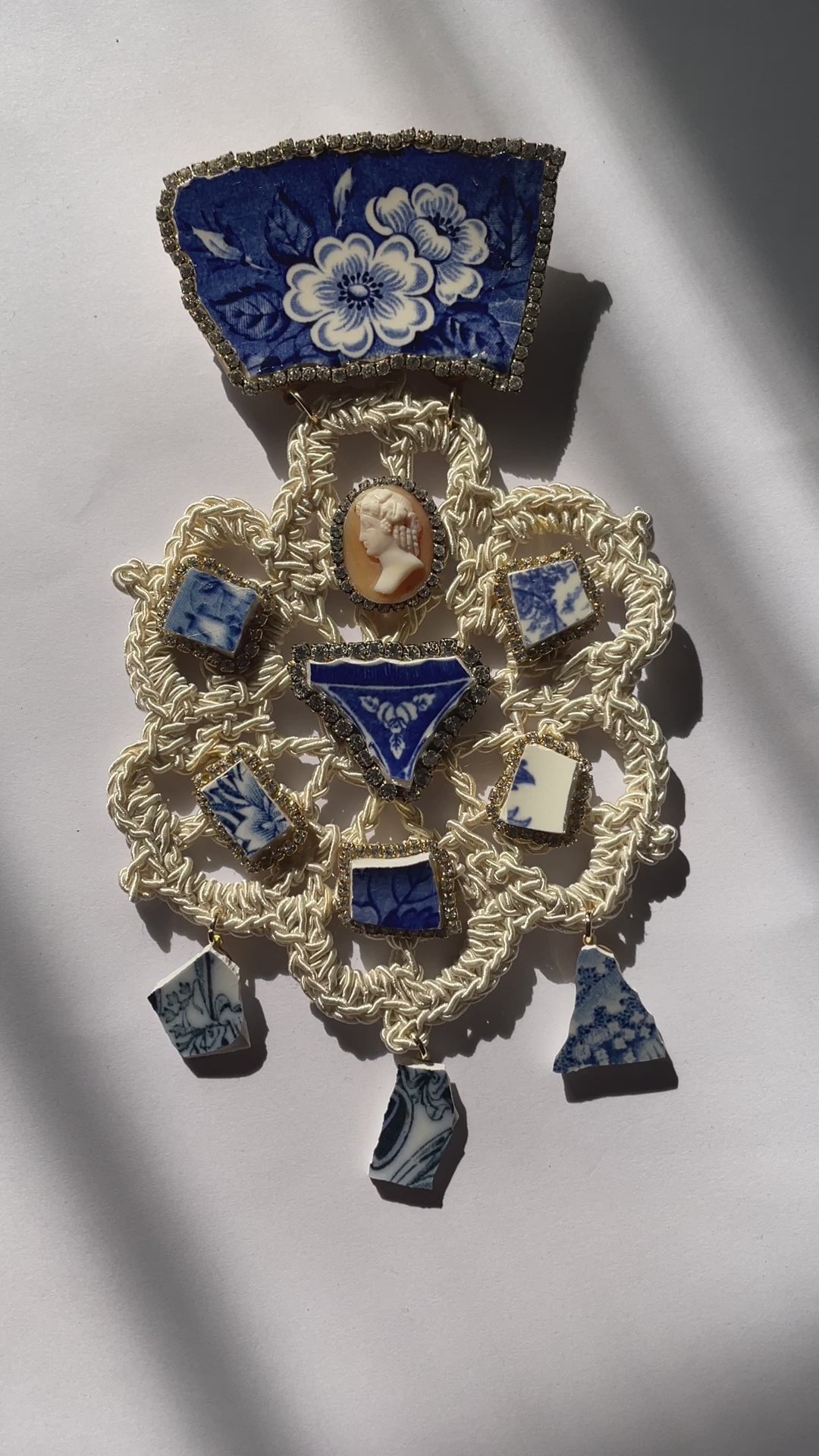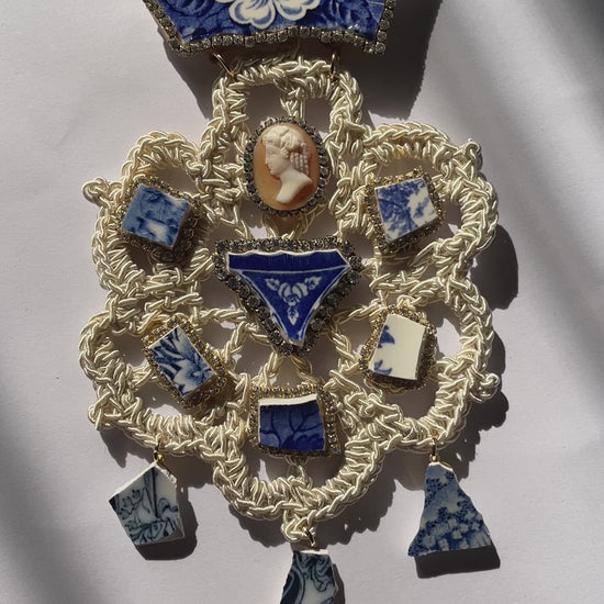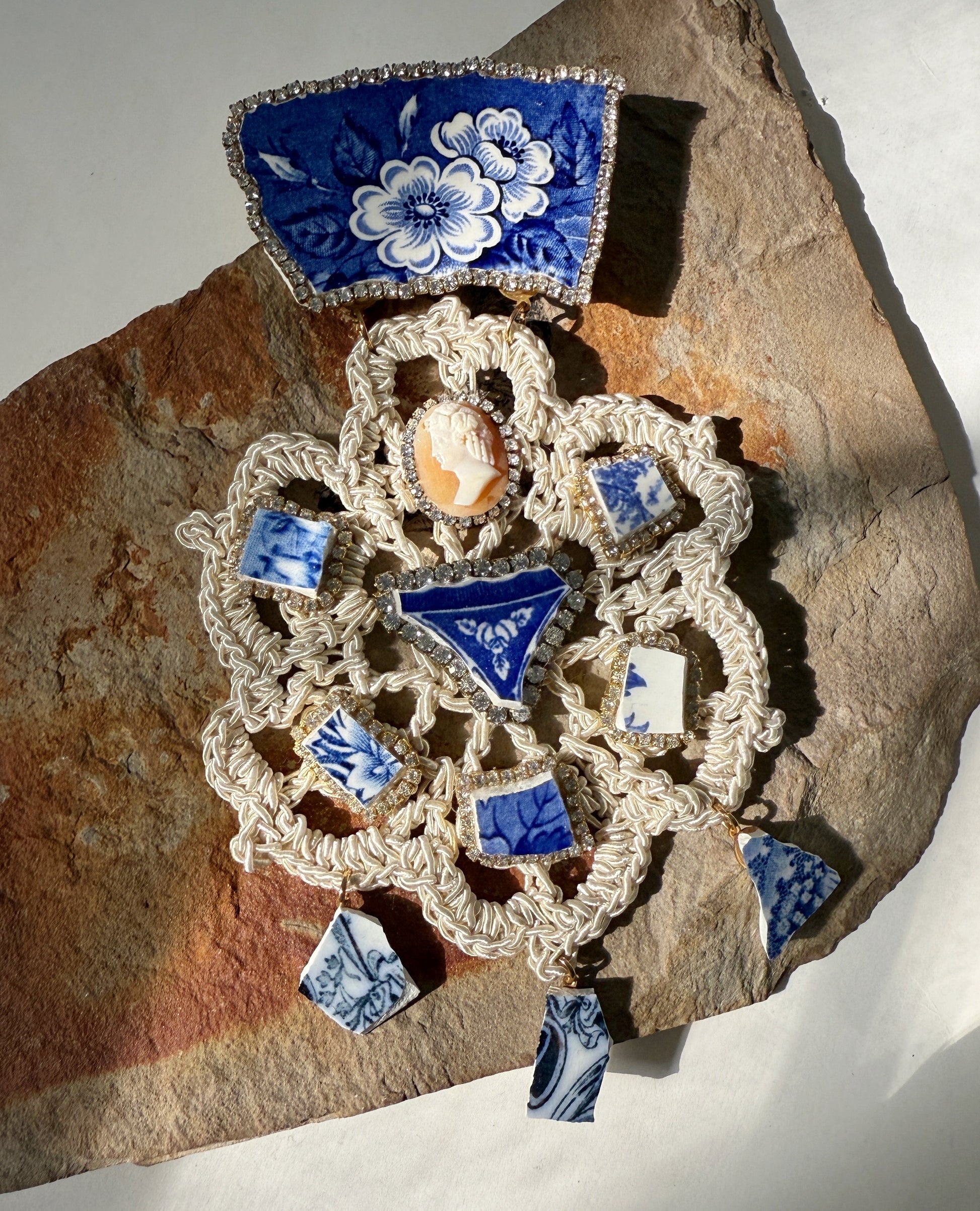 statement hand crocheted flower with vintage broken ceramics, rhinestones and carved cameo